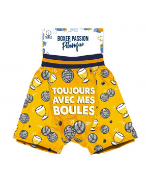BOXER PASSION PETANQUE TAILLE L. Pour un cadeau humoristique à offrir pour votre ami, notre boxer taille L "Toujours avec mes boules" est fait pour vous.