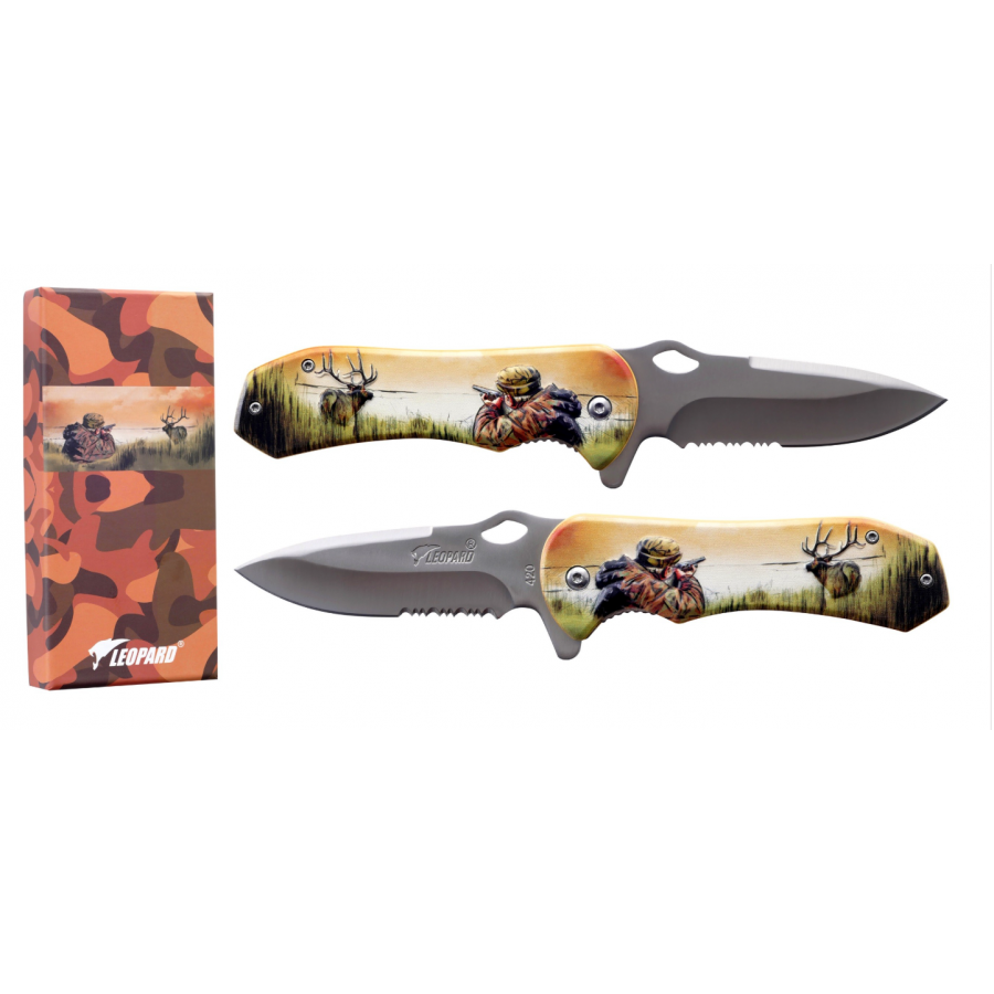 Le couteau pliant Leopard Chasseur est l’outil parfait pour les passionnés de chasse et d’activités en plein air. Sa lame en acier inoxydable dentelée permet de couper avec précision, tandis que son design illustré évoque la sérénité d’une journée en plein air .