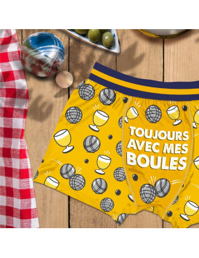 BOXER PASSION PETANQUE TAILLE L. Pour un cadeau humoristique à offrir pour votre ami, notre boxer taille L "Toujours avec mes boules" est fait pour vous.
