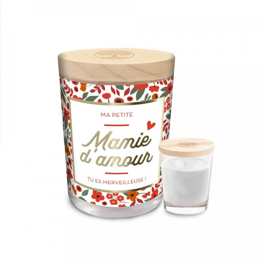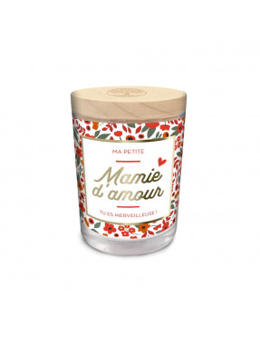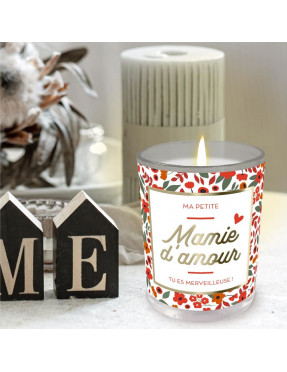 Avec l’inscription "MAMIE D'AMOUR", cette bougie blanche à motifs fleuris oranges, verts et marrons est un cadeau d’exception à offrir à votre mamie chérie !